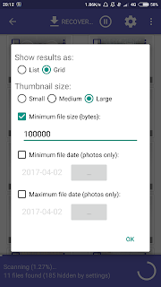 Oh ya, aplikasi ini membutuhkan akses Root untuk memulihkan ukuran penuh foto, kalau belum root cuma bisa memulihkan ukuran foto yang ada di thumbnail (biasanya di folder DCIM).